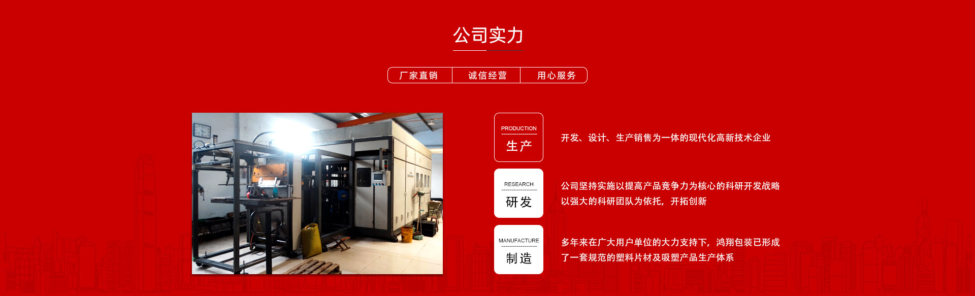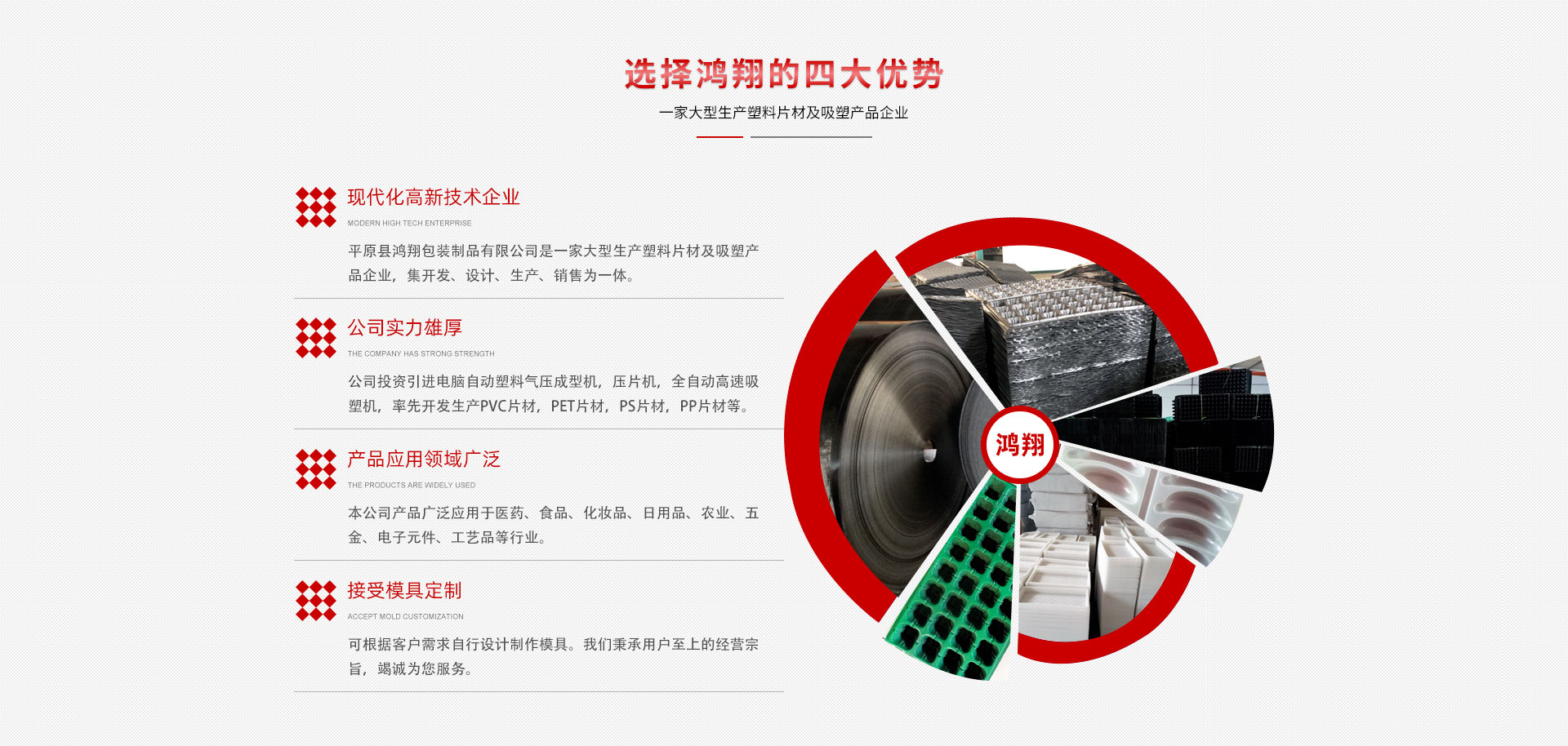 平原縣鴻翔包裝制品有限公司是一家大型生產塑料片材及吸塑產品企業(yè),本公司投資引進電腦自動塑料氣壓成型機,壓片機,全自動高速吸塑機,率先開發(fā)生產PVC片材,PET片材,PS片材,PP片材等,鴻翔是國內先進的生產廠家之一。本公司產品廣泛應用于醫(yī)藥、食品、化妝品、日用品、農業(yè)、五金、電子元件、工藝品等行業(yè),也可根據客戶需求自行設計制作模具。本公司技術力量雄厚,生產設備工藝先進。我們秉承用戶至上的經營宗旨,竭誠為您服務。